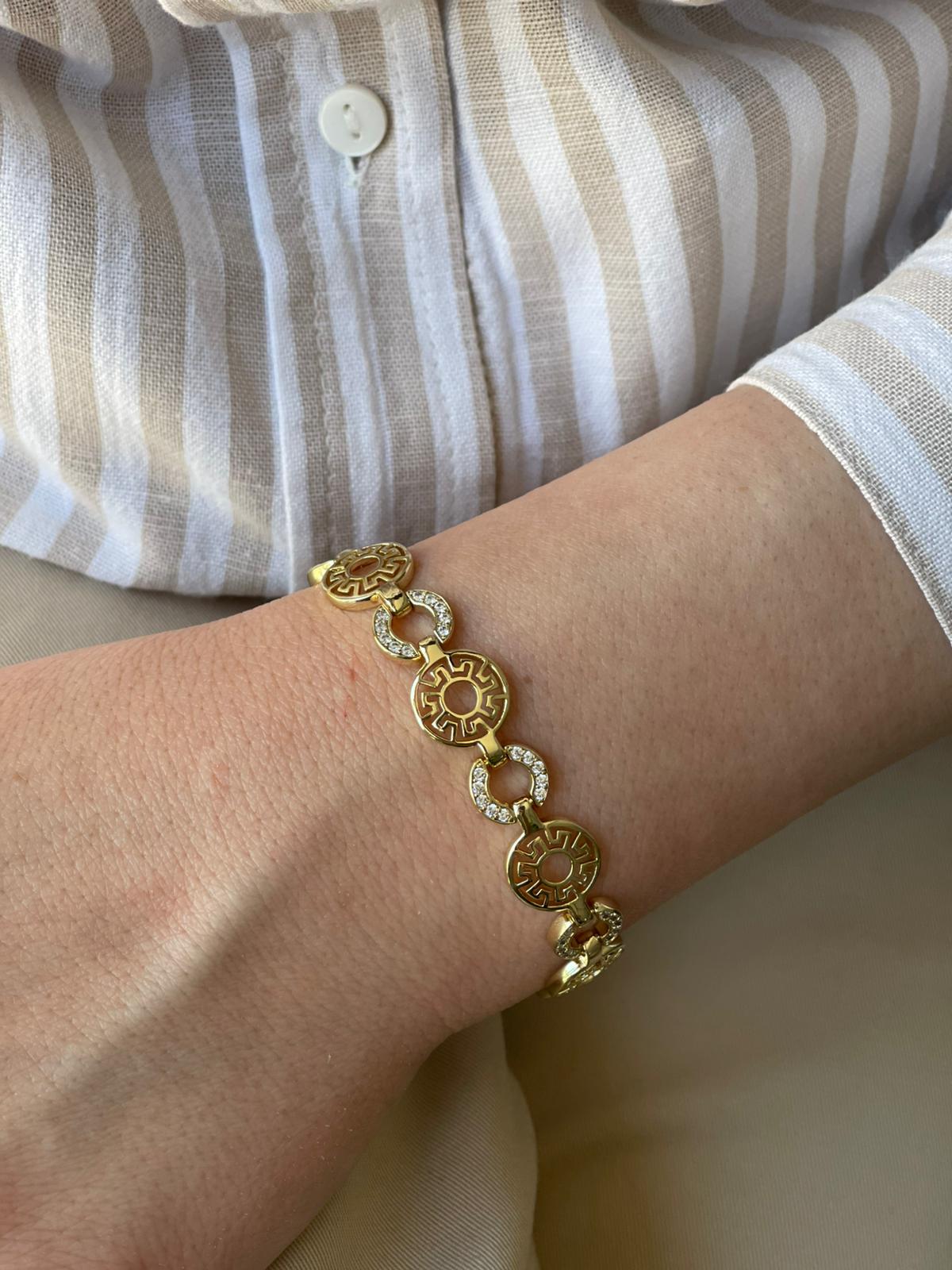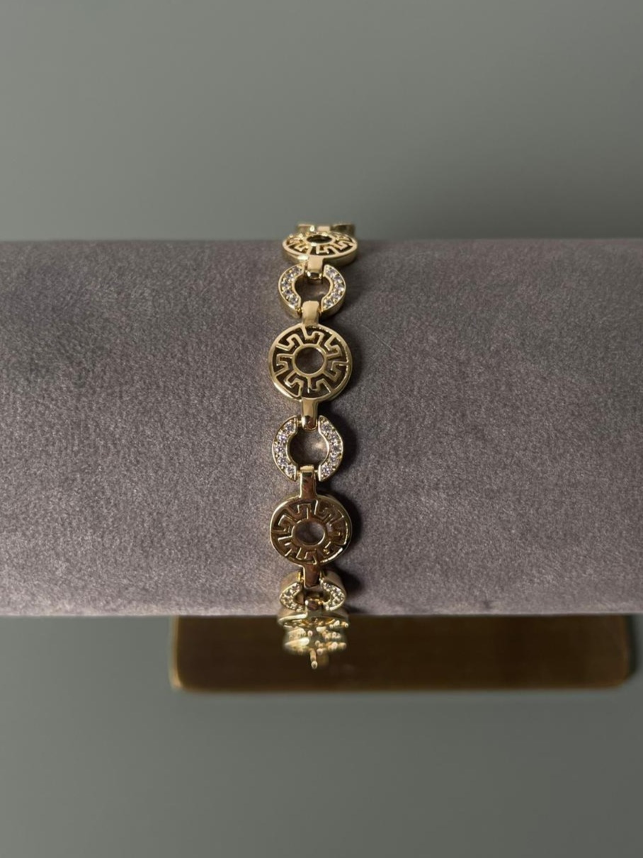 Şıklığı ve modern tasarımı ile öne çıkan bu bileklik, 14 ayar altın işçiliği ile hazırlanmış olup, Dayanıklı çelik gövde üzerine özenle işlenmiş taş detaylarıyla parıltısını ortaya koyuyor.