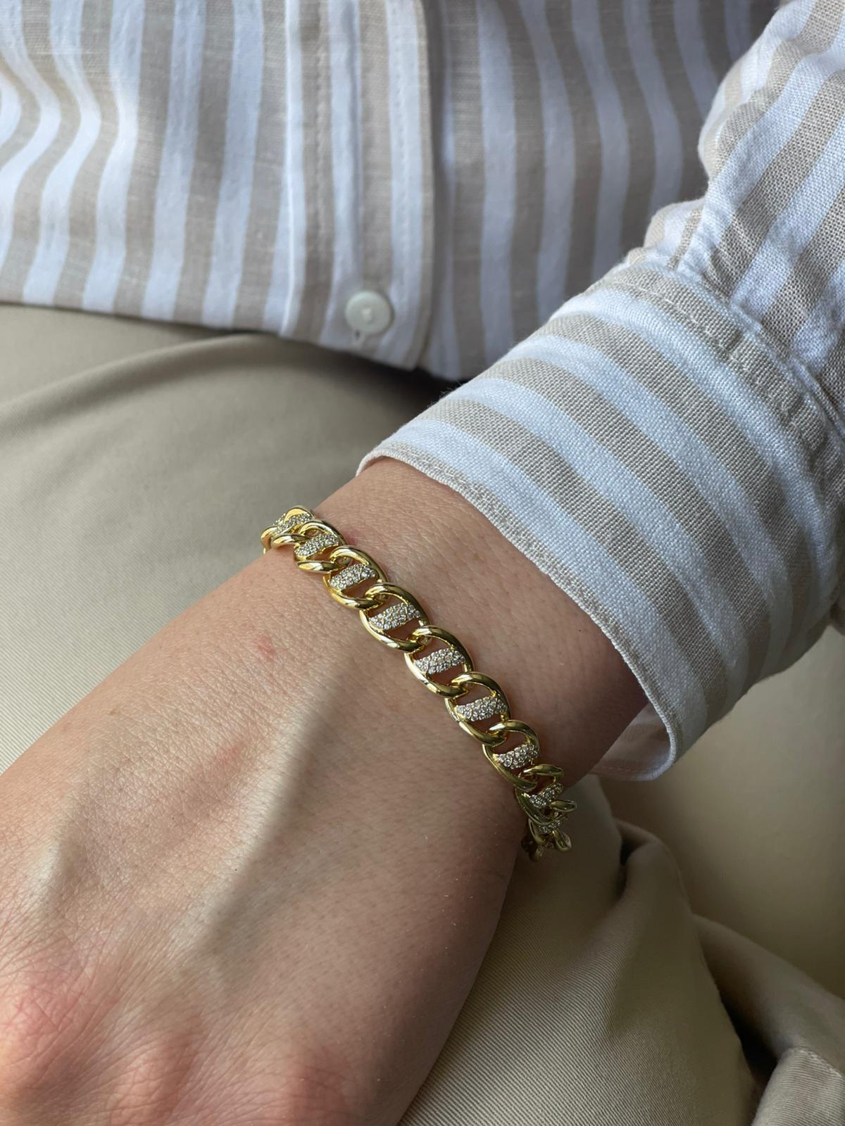 Şıklığı ve modern tasarımı ile öne çıkan bu bileklik, 14 ayar altın işçiliği ile hazırlanmış olup, Dayanıklı çelik gövde üzerine özenle işlenmiş taş detaylarıyla parıltısını ortaya koyuyor.