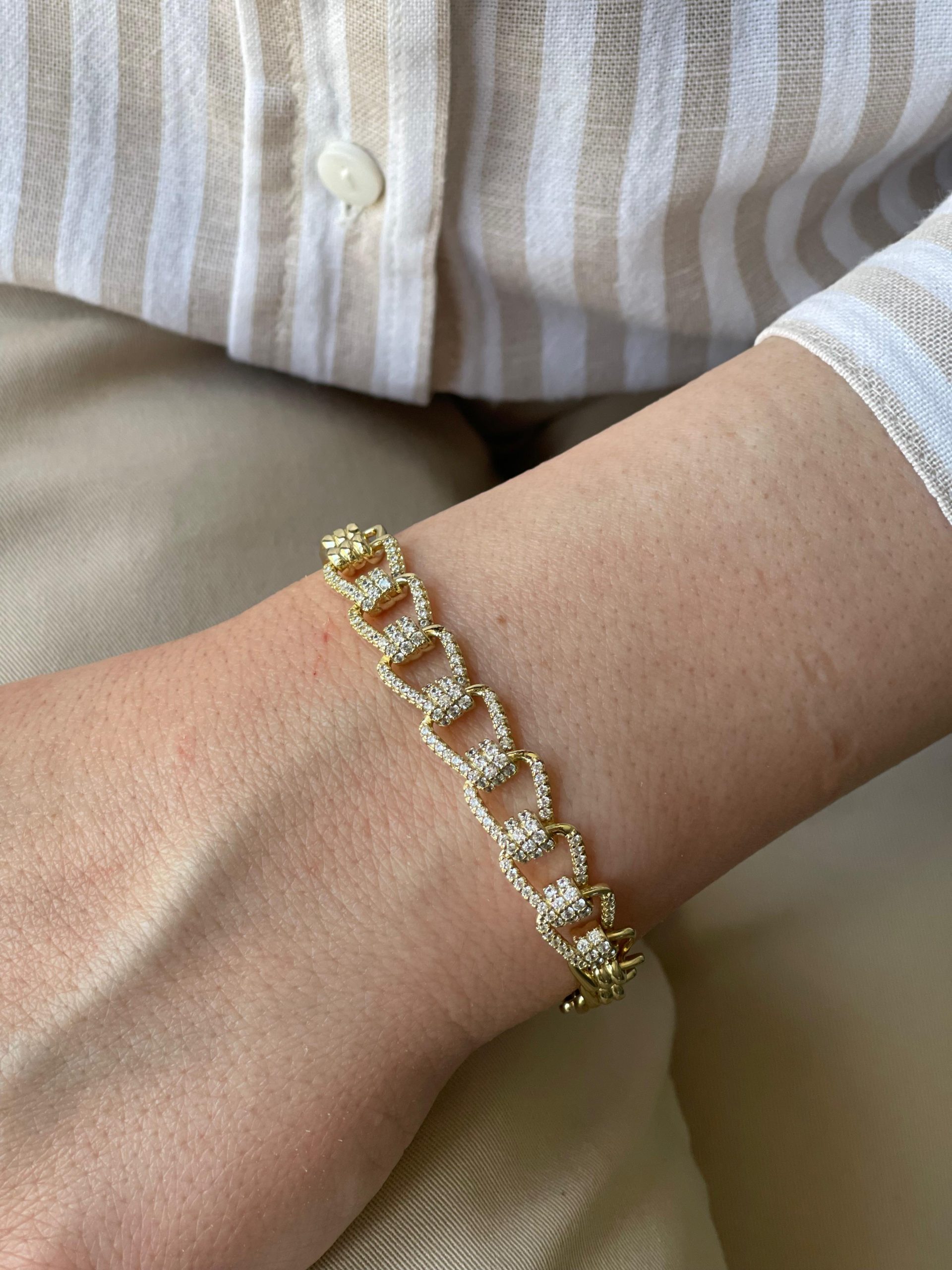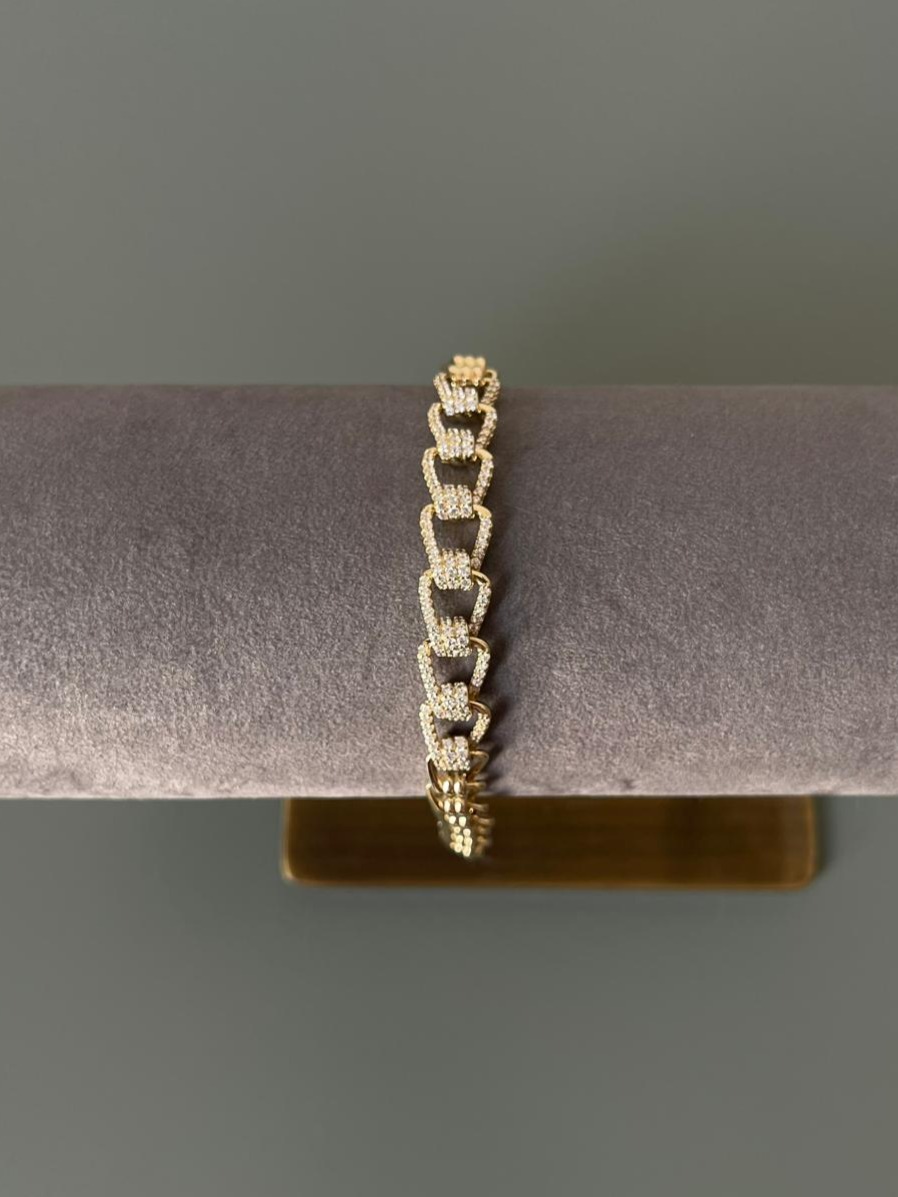 Şıklığı ve modern tasarımı ile öne çıkan bu bileklik, 14 ayar altın işçiliği ile hazırlanmış olup, Dayanıklı çelik gövde üzerine özenle işlenmiş taş detaylarıyla parıltısını ortaya koyuyor.