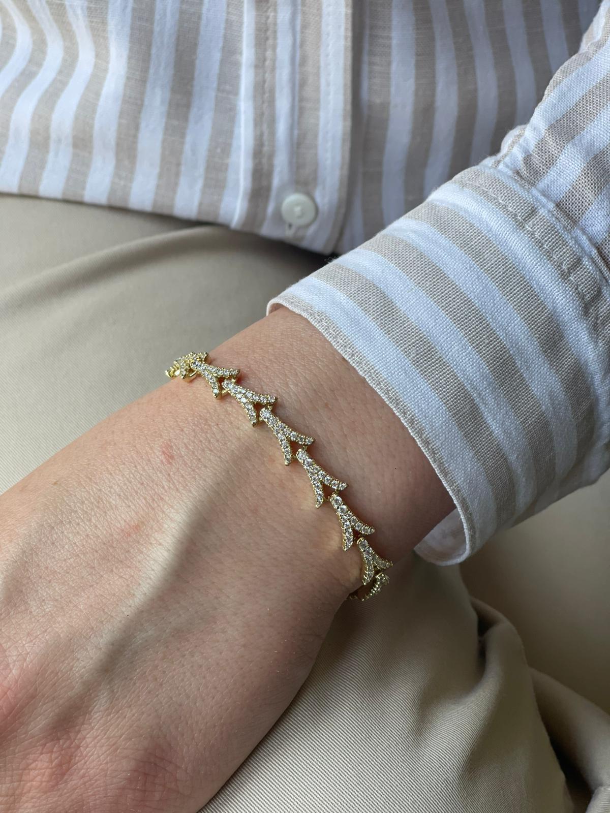 Zarif ve modern tasarımıyla dikkat çeken bu bileklik, halka formunun asaletiyle ışıltılı taş detaylarını bir araya getiriyor. Altın tonundaki şık halkalar, ortasında yer alan taşlarla işlenmiş yuvarlak detay sayesinde bileğinizde göz alıcı bir parıltı yaratıyor.