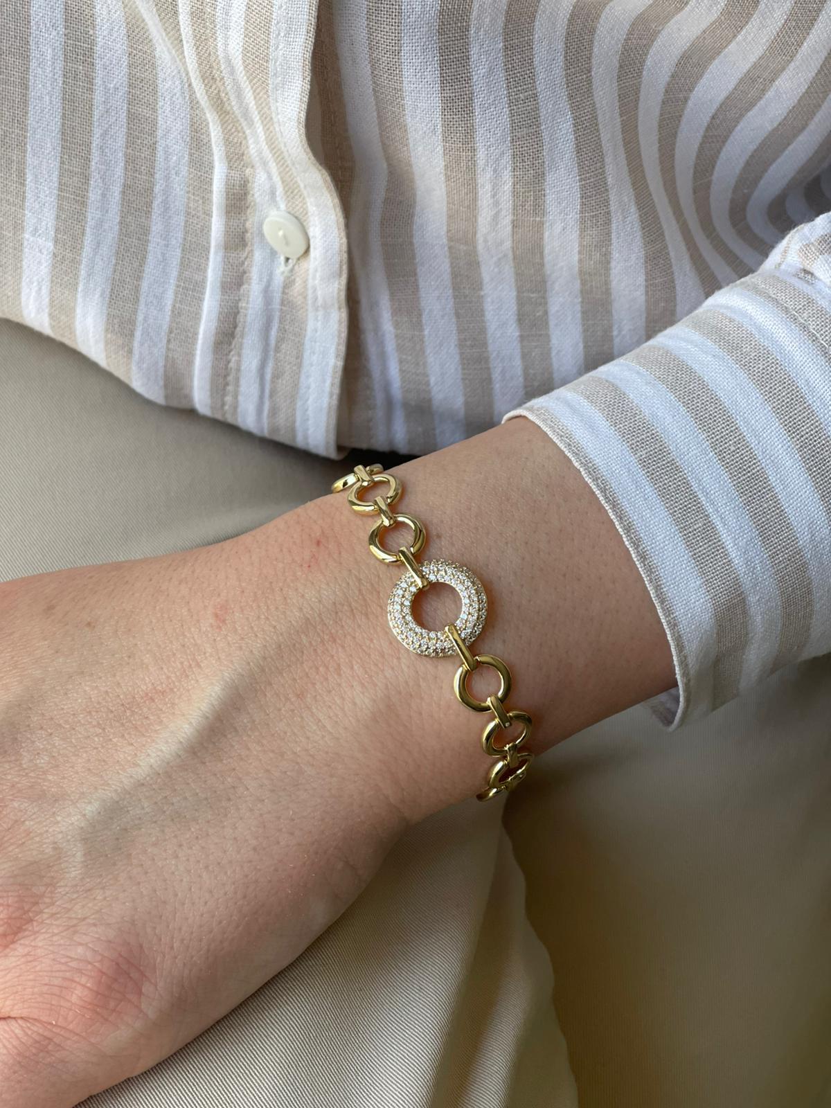 Zarif ve modern tasarımıyla dikkat çeken bu bileklik, halka formunun asaletiyle ışıltılı taş detaylarını bir araya getiriyor. Altın tonundaki şık halkalar, ortasında yer alan taşlarla işlenmiş yuvarlak detay sayesinde bileğinizde göz alıcı bir parıltı yaratıyor.