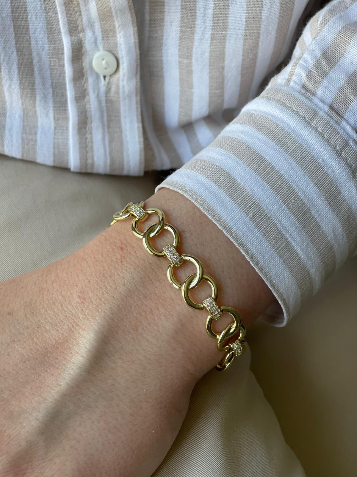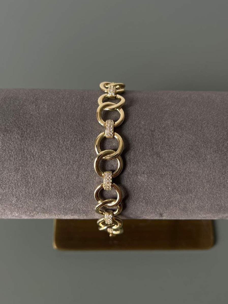 Şıklığı ve modern tasarımı ile öne çıkan bu bileklik, 14 ayar altın işçiliği ile hazırlanmış olup, Dayanıklı çelik gövde üzerine özenle işlenmiş taş detaylarıyla parıltısını ortaya koyuyor.